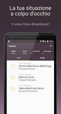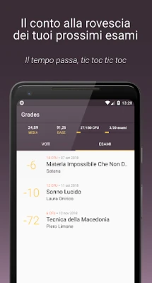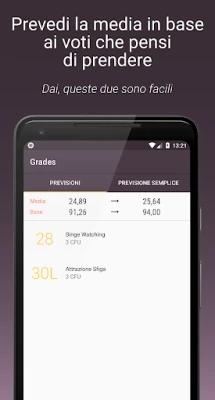 Con **Grades**, avrai una visione cristallina di ogni aspetto del tuo progresso. Potrai archiviare con precisione lo storico di tutti i voti ottenuti, costruendo un resoconto dettagliato della tua preparazione. Ogni esame in arrivo sarà comodamente tracciato, permettendoti di organizzare lo studio senza stress. Crediti formativi, la tua media ponderata e la base laurea saranno sempre visibili in un colpo d'occhio, aggiornati in tempo reale e pronti per essere consultati in qualsiasi momento, liberandoti dalla schiavitù dei conti manuali.