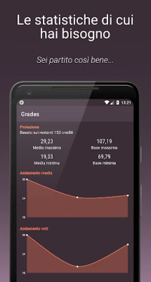 Ma **Grades** va ben oltre la semplice registrazione. Immergiti in statistiche approfondite sull'andamento dei tuoi voti e della tua media, comprendendo a fondo l'influenza di ogni singola materia sul tuo rendimento complessivo. Sfrutta gli innovativi strumenti di previsione per simulare scenari futuri, calcolando la media e la base laurea che potresti raggiungere con gli esami rimanenti. E per non perdere mai il filo, approfitta delle Note rapide, organizza aule e orari con l'Orario Lezioni e imposta promemoria per le scadenze relative alle tasse universitarie. È il tuo alleato indispensabile per un successo senza sorprese.