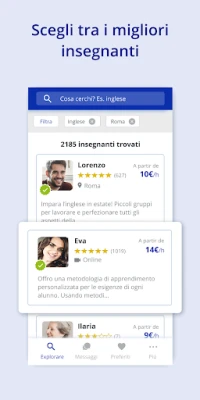 Desideri eccellere nei tuoi studi, padroneggiare una nuova lingua o scoprire una passione inedita? letuelezioni è la tua soluzione gratuita e intuitiva per connetterti con l'insegnante privato ideale. Che tu stia cercando ripetizioni di matematica, un tutor di inglese, lezioni di programmazione o persino un istruttore di yoga nella tua zona, la piattaforma letuelezioni offre accesso a un vasto network di professionisti qualificati per oltre 350 materie. Affina la tua ricerca per esperienza, qualifiche, opinioni di altri studenti e vicinanza, assicurandoti una scelta personalizzata e perfettamente allineata alle tue esigenze.