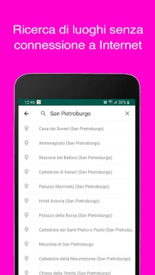 Ogni singola funzionalità di questo strumento è stata pensata per operare perfettamente anche in assenza di rete. Esplorate San Pietroburgo con una mappa dettagliatissima e una guida completa, scoprendo ogni angolo della città. Tutti i punti di interesse, dalle cattedrali maestose ai giardini nascosti, sono chiaramente indicati, accompagnati da approfondite descrizioni basate su fonti come Wikipedia per arricchire la vostra conoscenza di ogni luogo. Trovare una via specifica o una destinazione è semplicissimo grazie alla ricerca indirizzi, mentre la comoda ricerca per categoria vi permetterà di individuare rapidamente aeroporti, stazioni della metropolitana, stazioni ferroviarie, hotel e molto altro, sempre e ovunque.